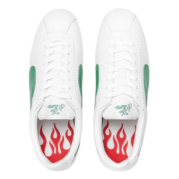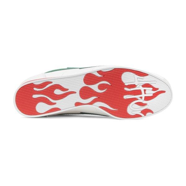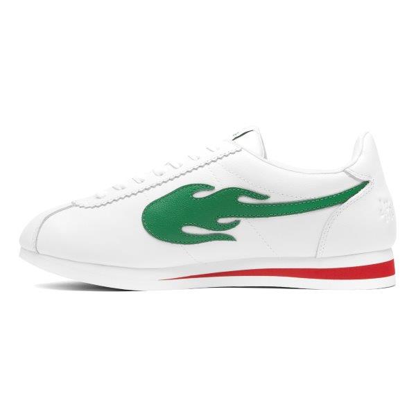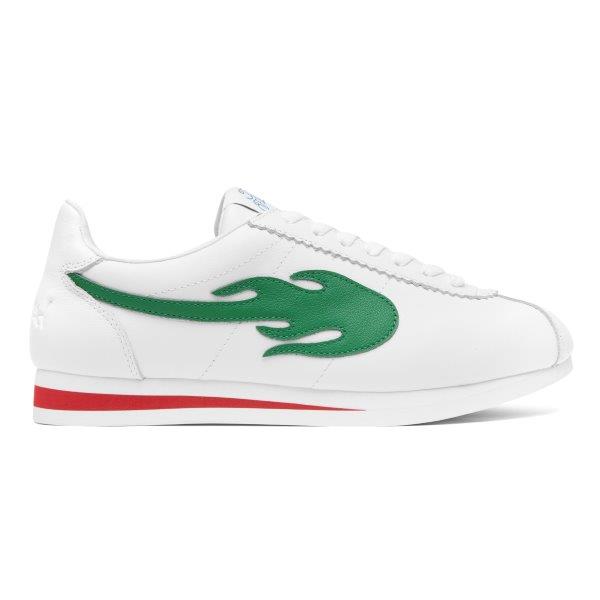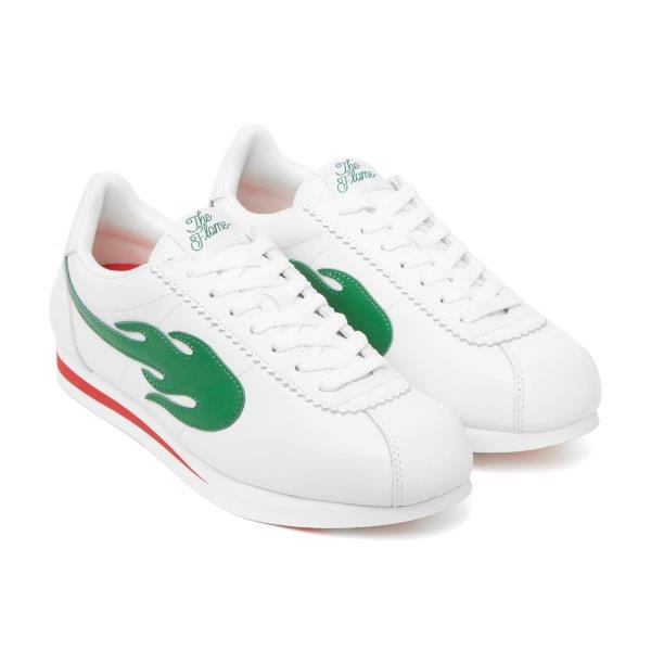 The latest green flame “BLOCK RUNNER” from multi-platinum performer, businessman, and philanthropist YG’s The Flame footwear is now available. It has a white upper and a red stripe running through the heel. The sole is available only online at 4Hunnid.com and contains the 4HUNNID emblem located on each installment with red and white flame detail.